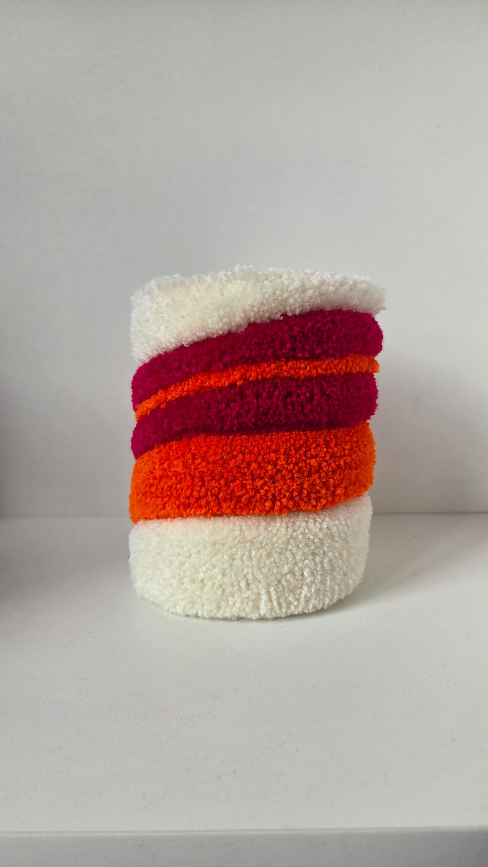 Tu peux choisir de créer un tapis mural ( format carré ou rectangle), une galette de tabouret, ou même un vase en laine.